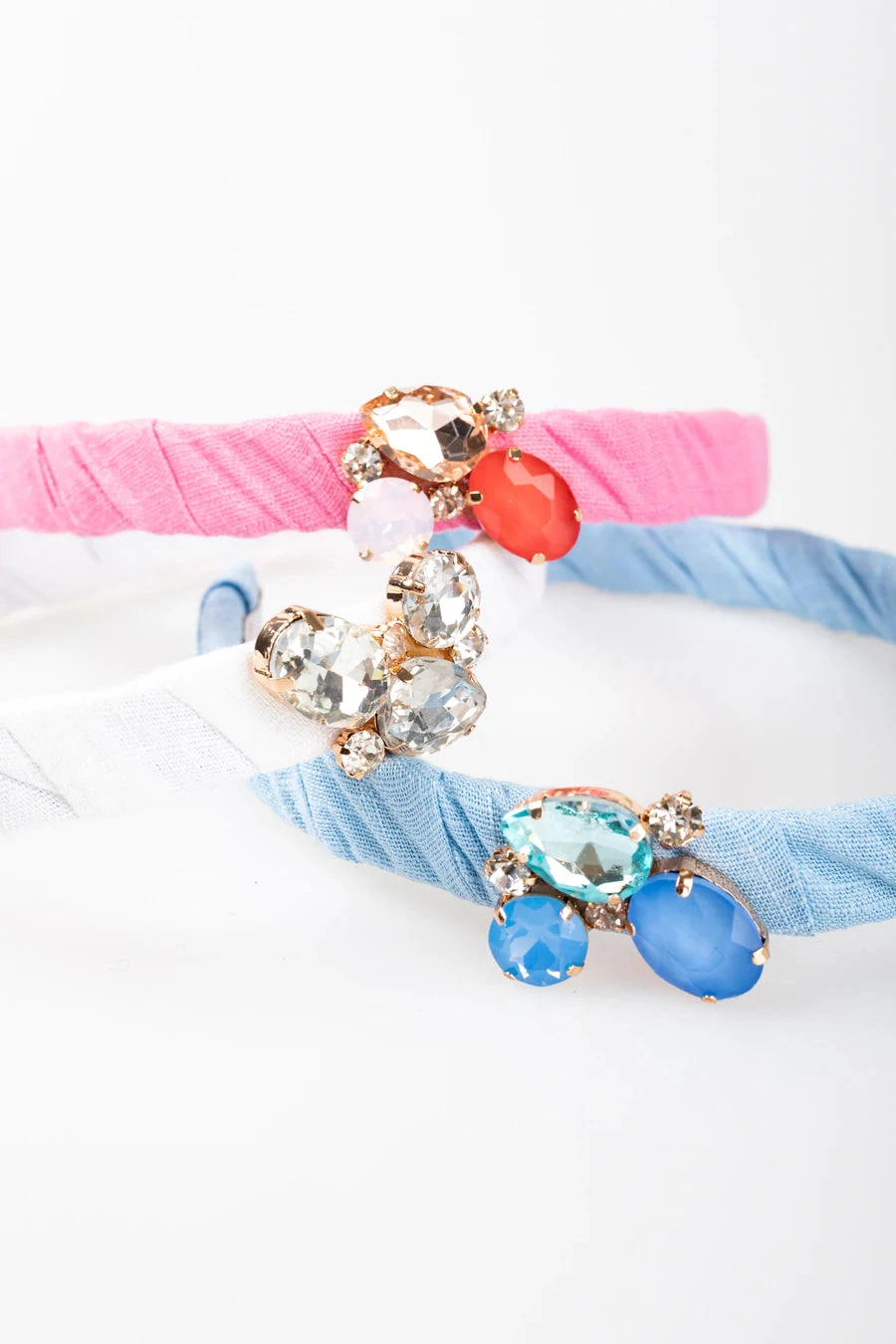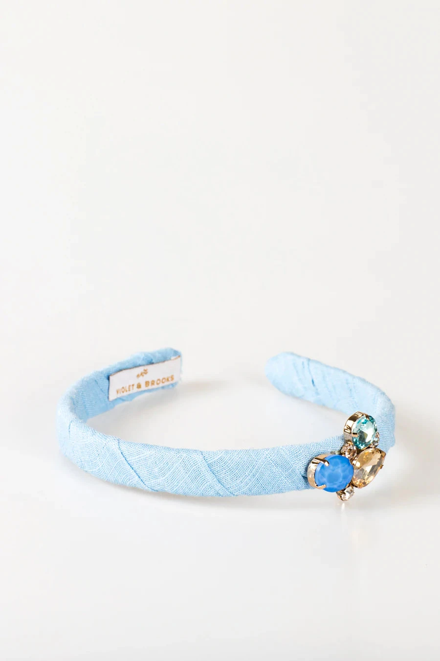 A cluster of sparkly crystals elevate this simple linen headband from casual to extra special. Easy enough to wear on the beach and out to a sunset dinner.