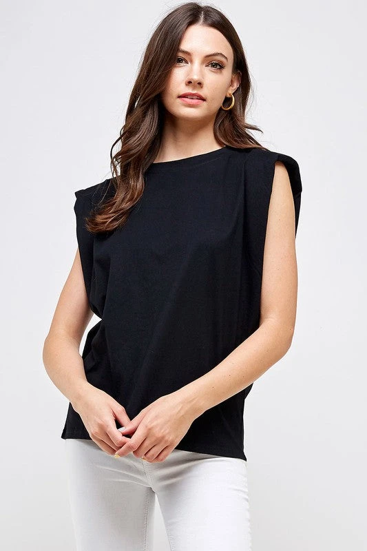 Padded Shoulder Muscle T-shirt. This Sleeveless Tee Features A Crew Neckline, Relaxed Silhouette, And Padded Shoulders. The Perfect On Trend T-shirt To Dress It Up, Or Dress It Down.