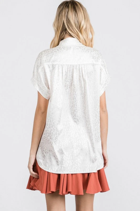 Satin leopard print button-up top with a collared neckline and short dolman sleeves.