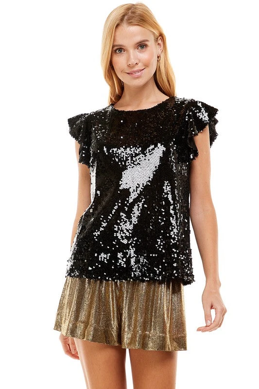 Sequin top featuring a round neck, ruffle detailed sleeve and back keyhole with button loop closures.