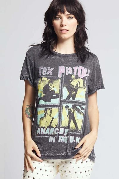 Cause some chaos in this “Anarchy In The U.K.” tee featuring the Sex Pistols’ hit song from their 1977 album, “Never Mind The Bollocks, Here’s The Sex Pistols”. Designed with photo graphics of the four band members with their logo and song title. Made with soft vintage washed fabric, sewn rolled up short sleeves, distressed hems, a ribbed crewneck, and a fitted silhouette.