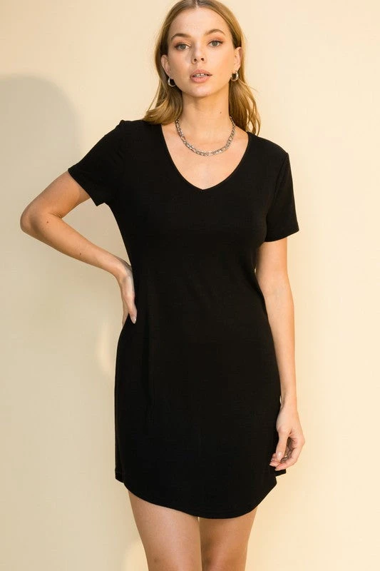 -SHORT SLEEVE V NECK CURVE HEM DRESS
