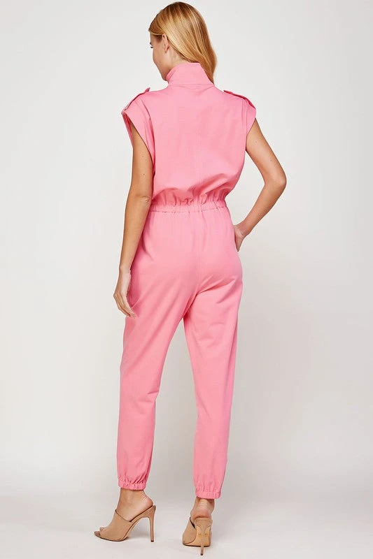 Pocket detail high neck sleeveless jumpsuit in Cotton stretch fabric. This style features folded sleeves with shoulder epaulettes, chest flap pockets, cinched elasticated waist, ankle length pants with elasticated cuff, and concealed front zipper closure.