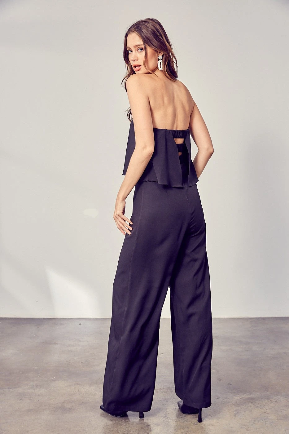 Woven jumpsuit, strapless, ruffle detail, wide leg.