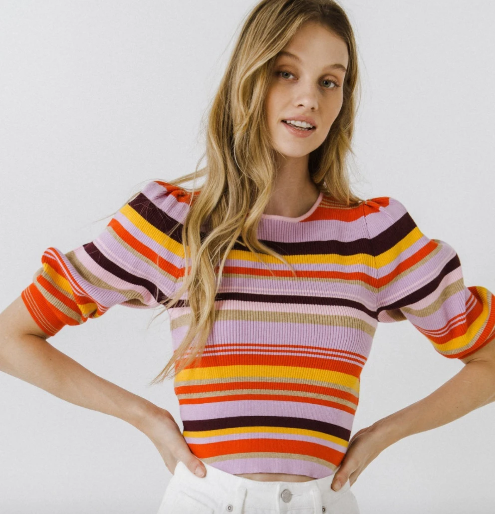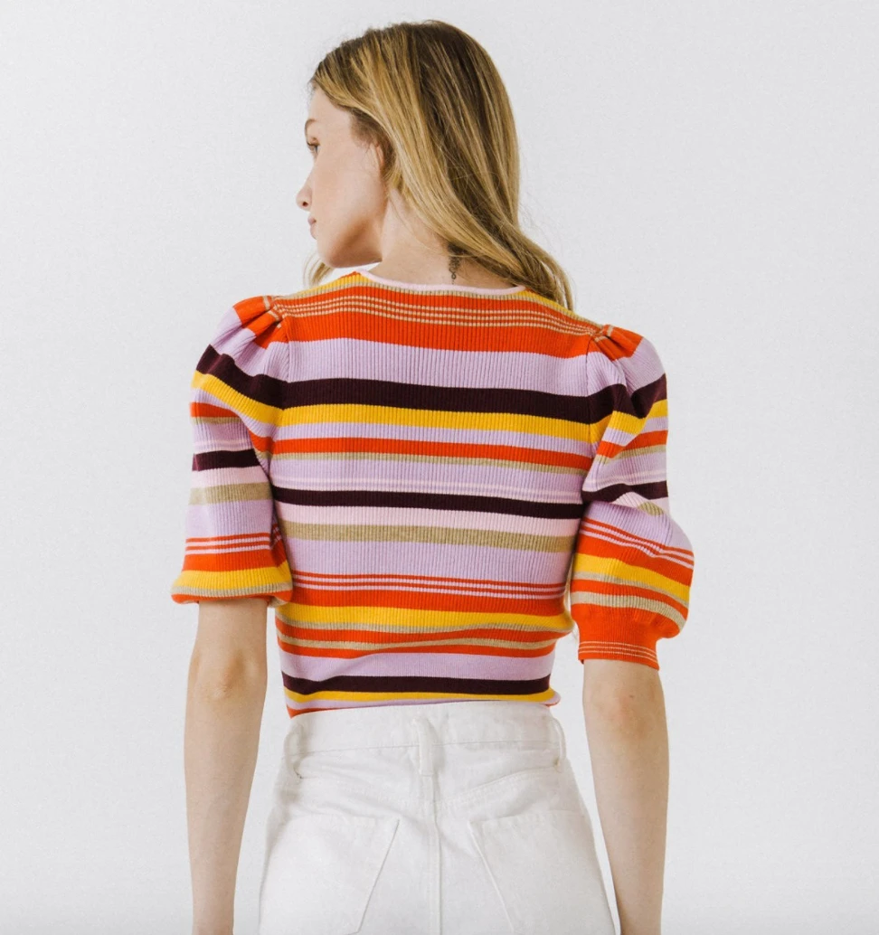 Multi Stripe, Puff Sleeve, Round Neckline.