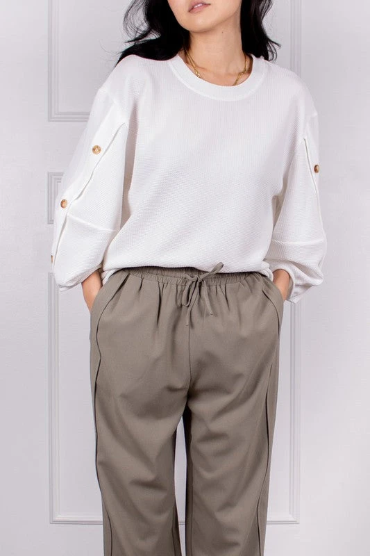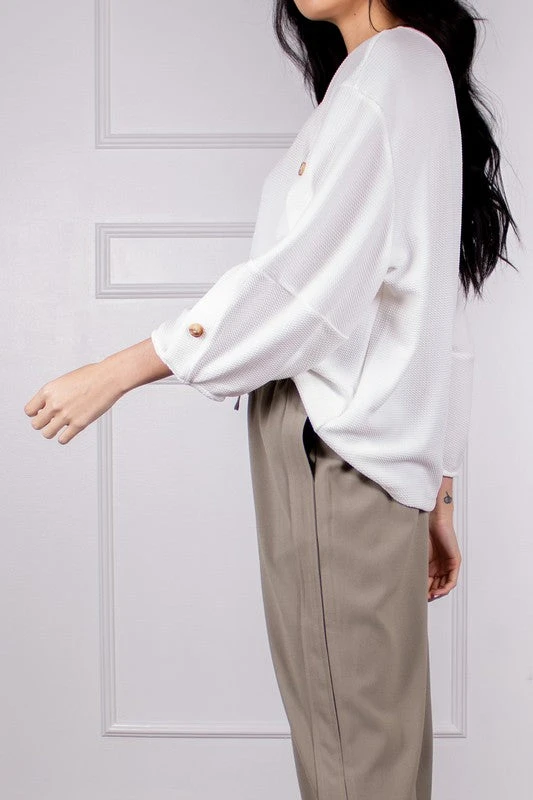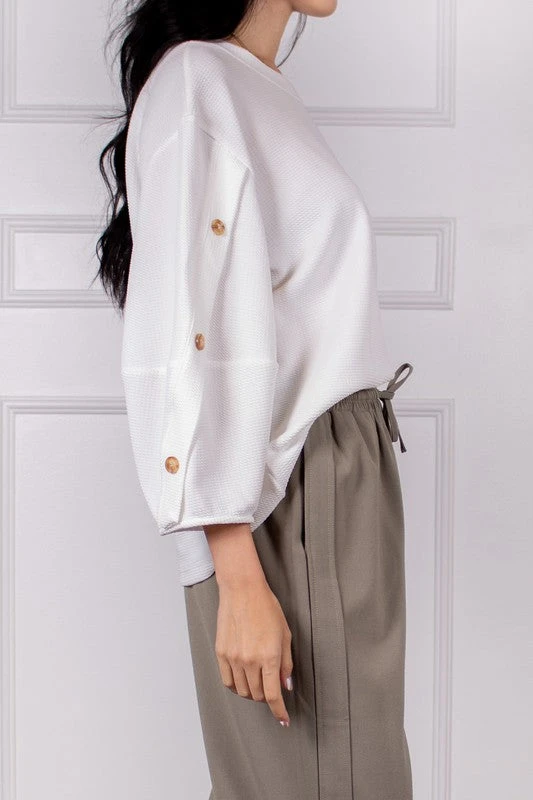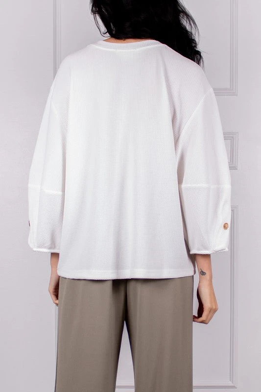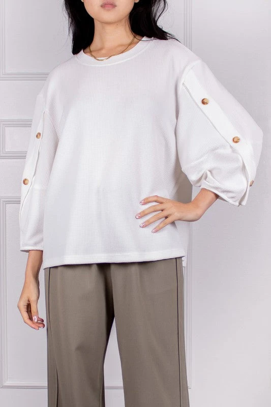 Textured Blouse With Accent Buttons On 3/4 Bishop Sleeves.