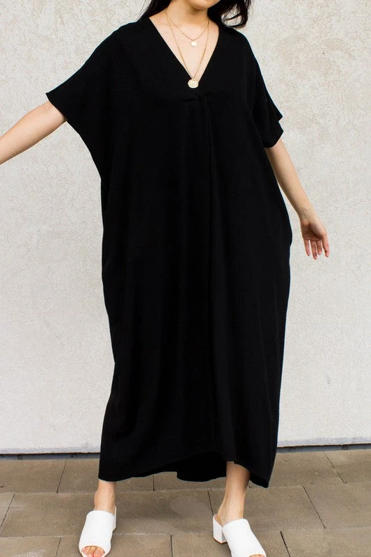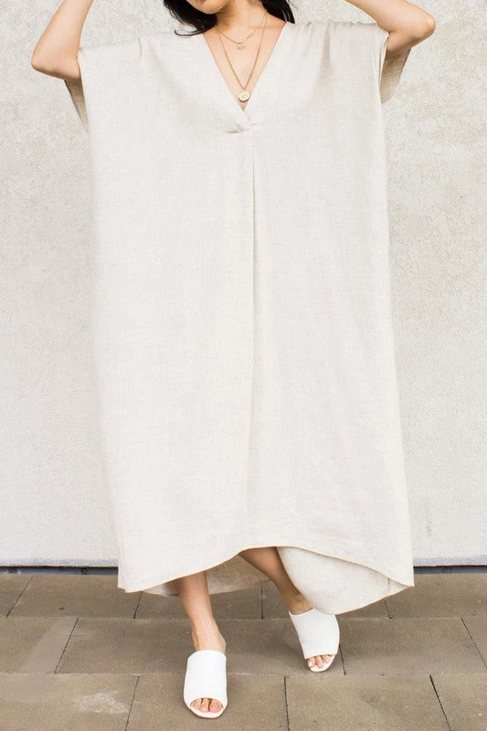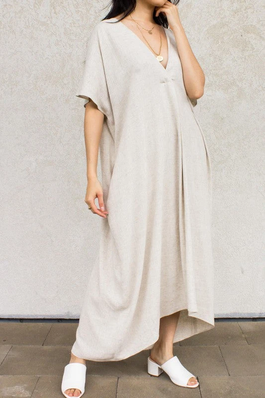 A linen cotton blend v neck hi-low midi length dress.