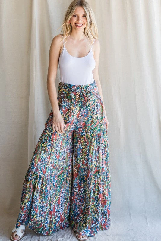 Watercolor floral print palazzo pants with stretchy waistline with self-tie feature and tiered seam construction.